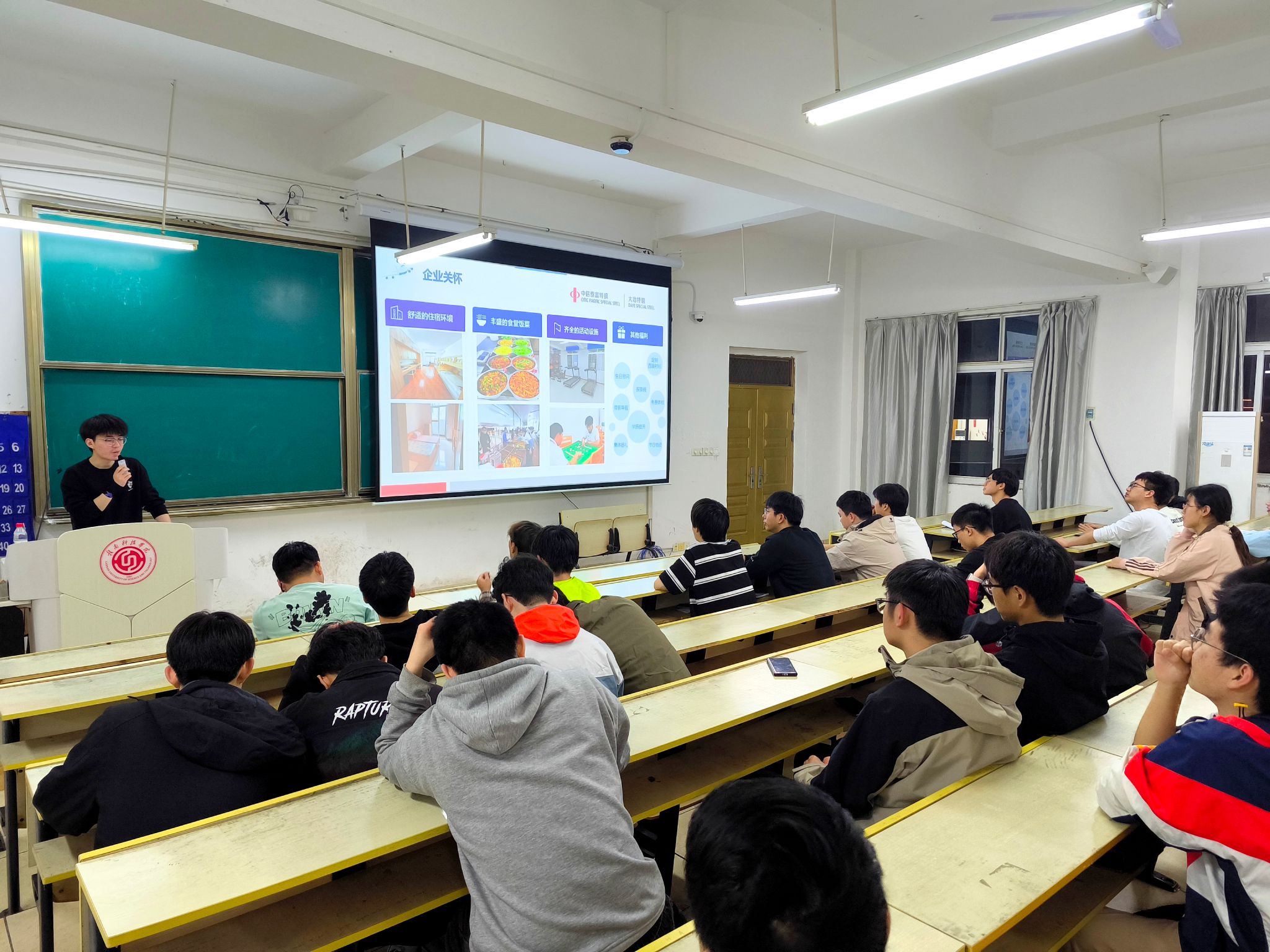 宣讲会上,大冶特殊钢有限公司的宣讲人黄浩先生详细介绍了公司的背景、运营项目和福利待遇等方面。大冶特殊钢有限公司作为全球最大的特钢企业集团——中信泰富特钢集团的主要成员企业之一,主营业务涵盖各种棒材、无缝钢管和锻材等特殊钢产品的生产和销售。其产品广泛应用于航天航空、海洋、核电、风电、交通、火电、油气、工程机械、重燃、船舶、石化、高铁等关键领域。
