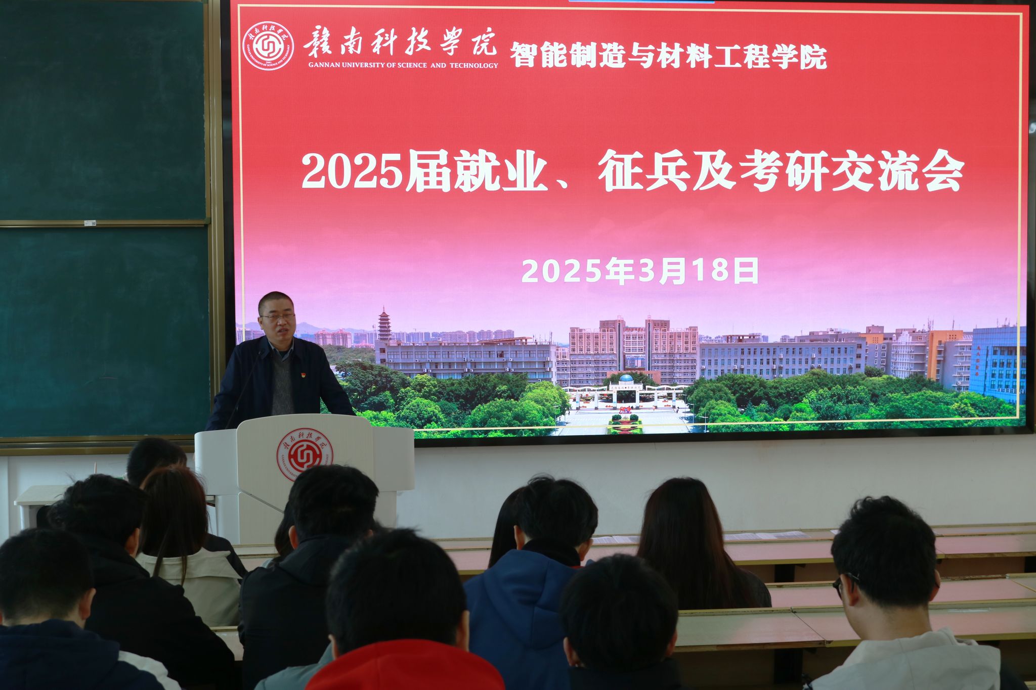 本网讯:为深入贯彻落实国家就业优先战略,切实做好2025届毕业生就业服务与指导工作,3月18日上午,william威廉英国官网于崇善楼Z1D2教室召开专题交流会,聚焦就业、征兵、考研三大主题,为毕业生明晰发展方向、凝聚奋进力量。智能制造与材料工程公司党委副书记朱根松,党委委员肖志华,毕业班辅导员及200余名毕业生代表共同参会。