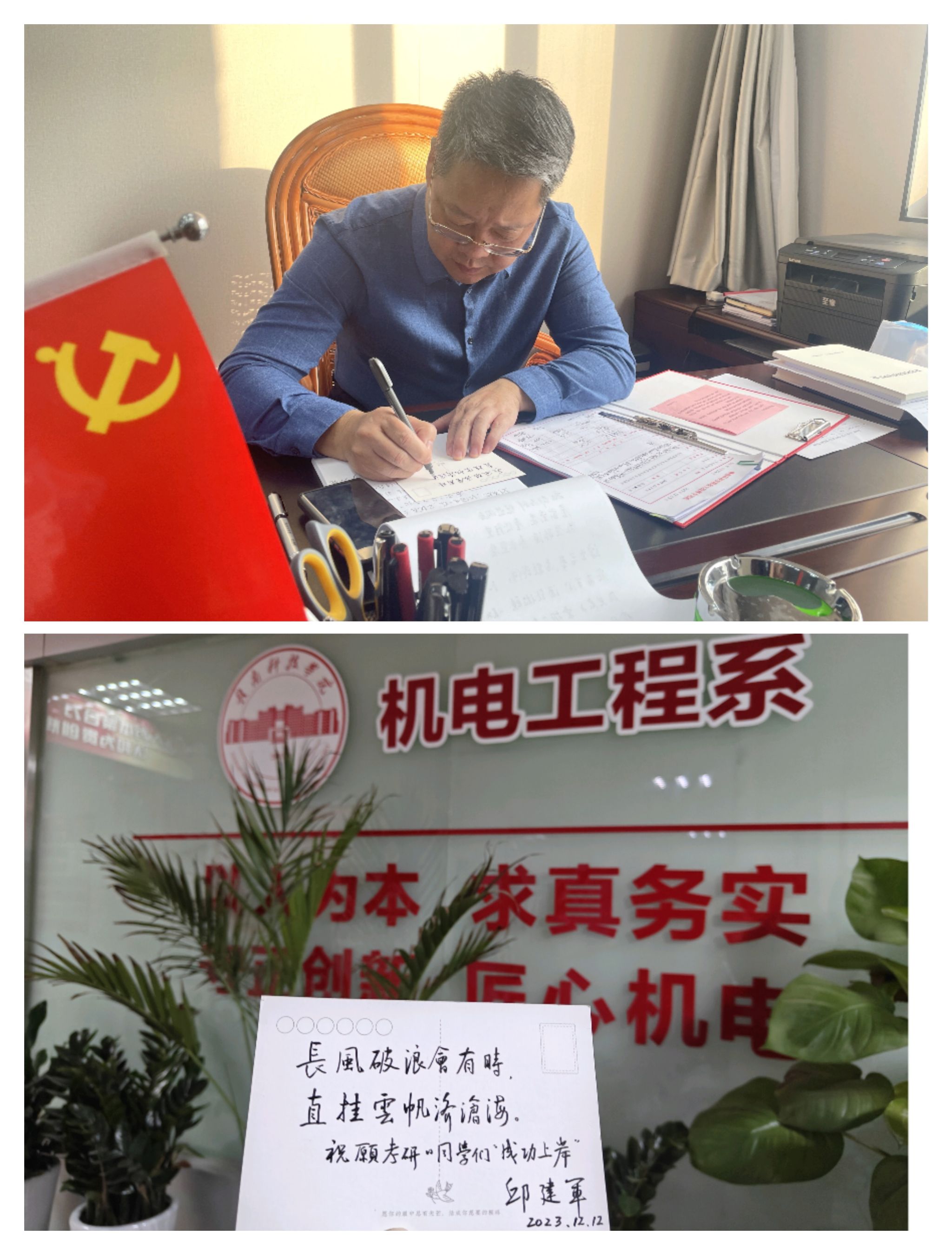 刘辉主任在此次动员大会上讲到:一岁时光一岁人,一年光景一番新,又一届的考研学子迎来了自己的人生转折,经过三百多个日夜的奋斗,现距离考研仅有10天,越到紧要关头,越要坚定,以平稳的心态应对考试。全体学子都要拥有两个“自信”,一是对自己三百多个日夜的不懈努力保持自信,二是要对机电工程系保持自信,我系历年来都把考研工作视为一项重中之重的工作,所有考研上岸的学子都是榜样。机电工程系全体师生与考研员工一起,坚持到最后!最后祝同学们一研为定,成功上岸!
