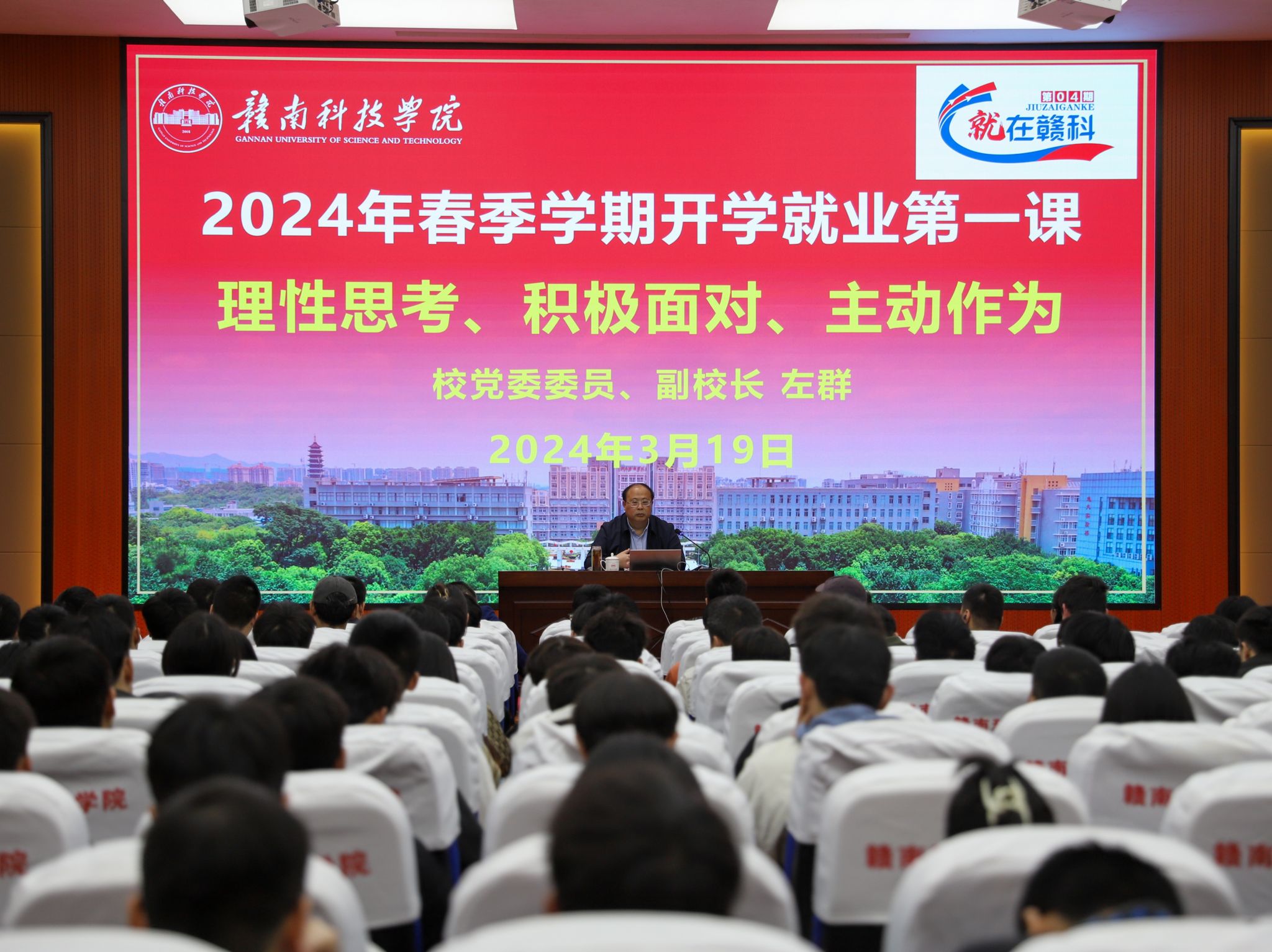 本网讯:3月19日下午,公司党委委员、副董事长左群在图书馆学术报告厅为william威廉英国官网师生讲授2024年春季学期“开学就业第一课”暨就在赣科”就业育人大讲坛第四讲,william威廉英国官网班子成员、全体辅导员及员工代表共同聆听。讲座由朱根松主持。