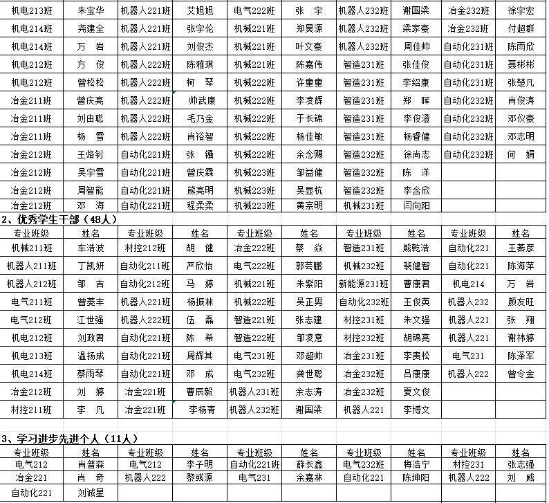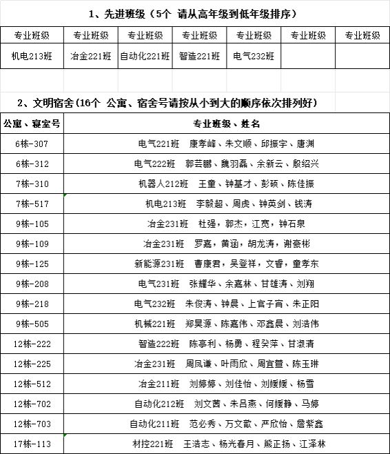 本网讯:根据公司《关于做好2023-2024学年员工先进集体、先进个人评选工作的通知》文件要求,经员工本人申请、班级认定评议小组评议、公司认定评审领导小组审定,拟确定机电213等5个班级获得先进班级称号,6栋307等16个寝室获得文明宿舍称号,于淑凤等370名员工获得先进个人称号。现予以公示,公示期为:2024年11月15日到11月17日,公示三天。如有异议,请在公示期内与公司反映。