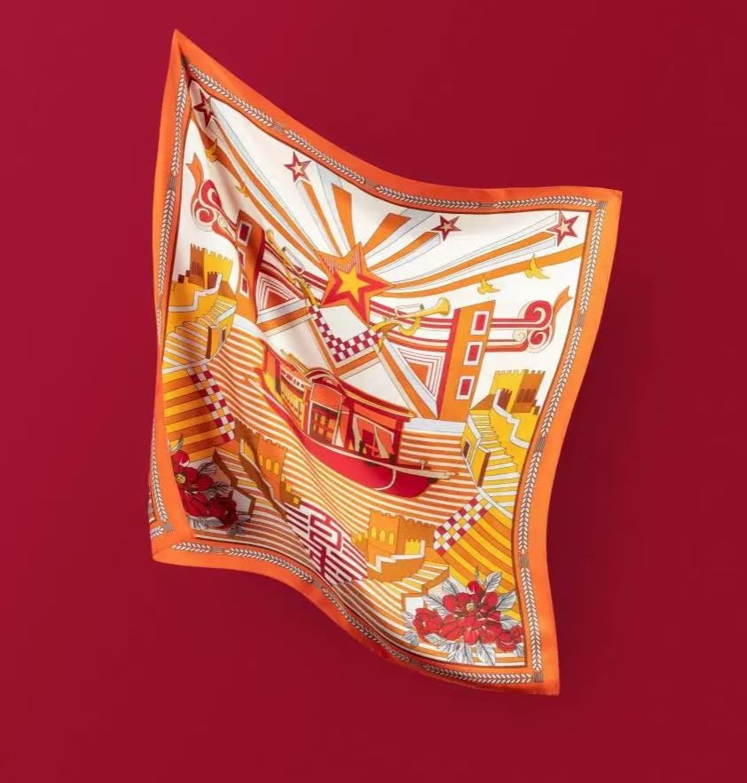 第一件是万事利红色文创系列产品之“辉煌百年”方巾。万事利以“春蚕”精神和温柔的情怀,融合红船精神、家国情怀和丝绸之美,打造系列红色文创产品,讴歌百年辉煌,颂扬精神境界,传达时代记忆。本作品,万事利丝绸以南湖红船为主要元素设计的“辉煌百年”方巾、“初心百年”方巾以及“初心百年”丝绸笔记本等多款红色文创精品被展出,一件件精美产品背后是一段段光辉的历史记忆,同样也让大家看到了红色文化在新时代的背景下迸发出的新的生命活力。万事利丝巾注重将传统文化元素与现代审美相结合,通过独特的图案与色彩传达深刻寓意,像以龙年为主题的丝巾,融合龙的图案、色彩和纹饰,展现吉祥寓意。