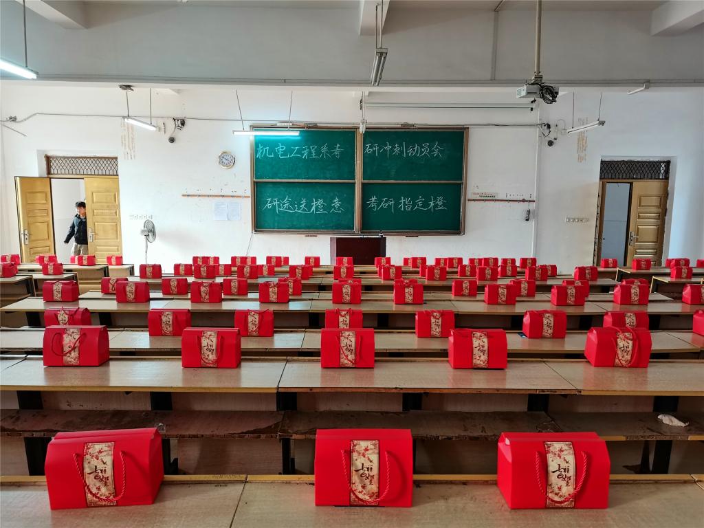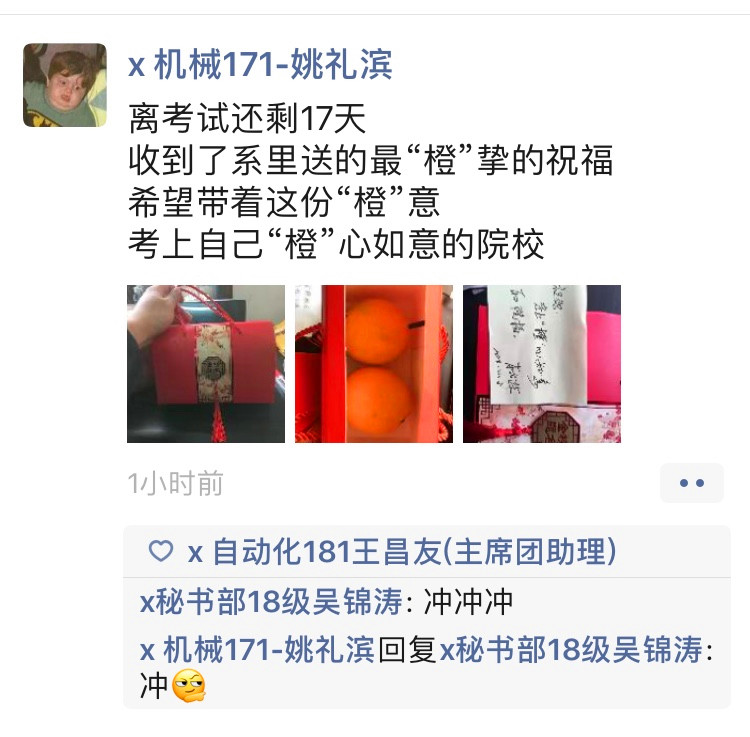 “离考试还剩16天,收到了系里送的最“橙”挚的祝福,希望带着这份“橙”意,考上自己“橙”心如意的院校。”江西理工大学应用科学公司机械171班考研学子姚礼滨在12月9日的朋友圈写到。