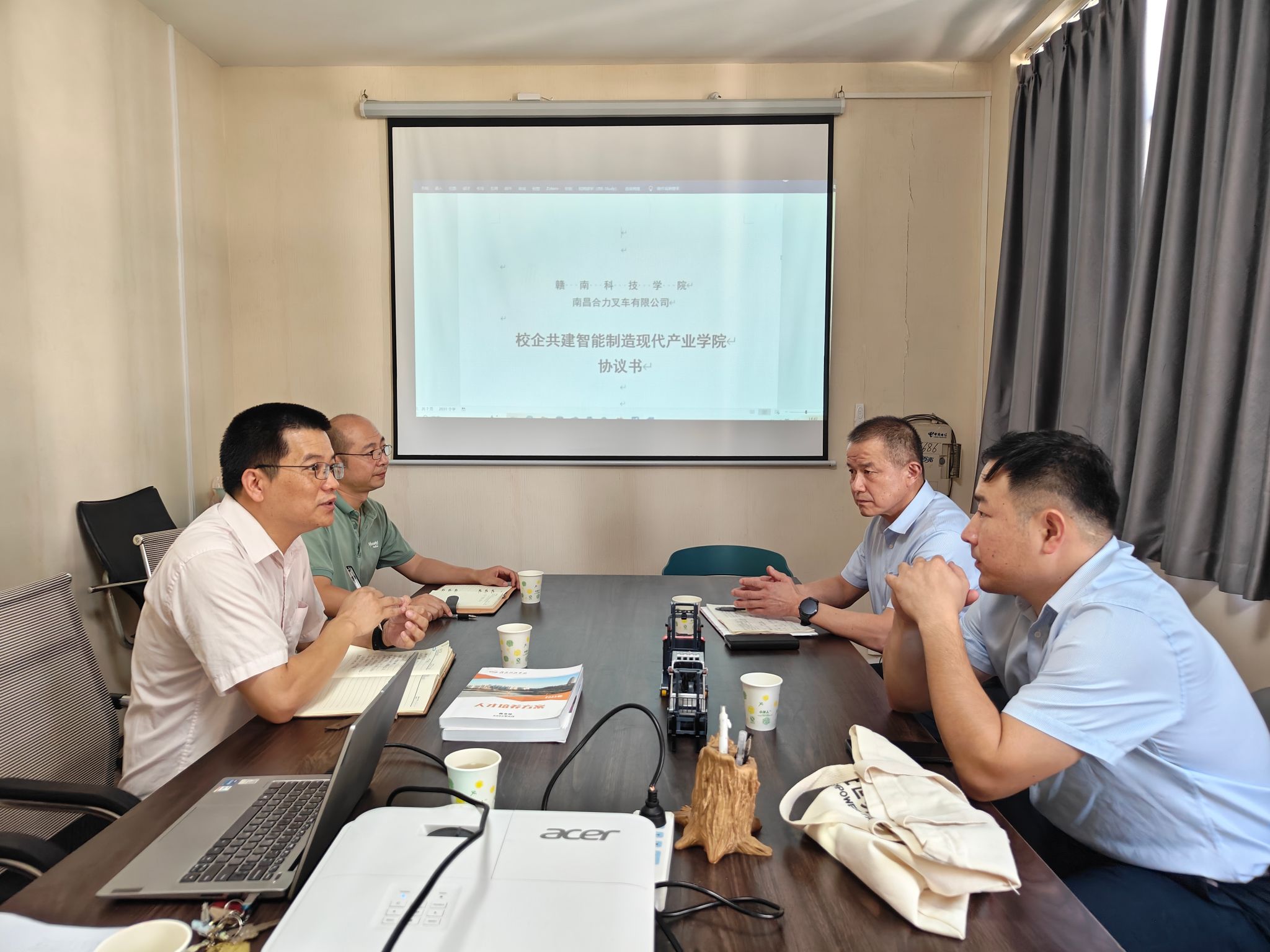 校企双方在智能制造现代产业公司会议室举行洽谈会。关开荣代表公司对企业到访表示欢迎,并介绍了公司在应用型人才培养、产学研协同创新等方面的成果。汪海波总经理充分肯定公司在机器人、智能制造等领域的教学实力,表示合力叉车正全面推进生产线智能化升级,亟需高校在技术研发与人才输送方面提供支持。双方围绕共建实习基地、订单式培养、技术共研等合作方向展开探讨,并就联合申报产业课题、开发专项课程等达成初步共识。