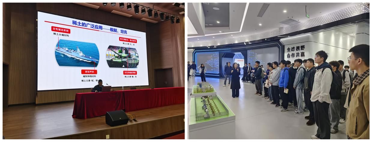 师生一行抵达后,首先在讲解员的引导下参观了稀金谷产业促进中心。在参观过程中,师生们通过丰富的实物展示,近距离观察了各类稀土矿石、冶炼中间产物及高端稀土材料成品,从原矿到磁性材料、发光材料、催化材料等终端产品的转化过程得以清晰呈现。沙盘模型生动再现了稀土资源分布、产业链空间布局及绿色矿山建设实景,配合多媒体动态演示,系统阐释了稀土从勘探开采、分离冶炼到精深加工的全链条流程。随后,师生在报告厅集中听取了两场专题报告。《神奇的稀土元素》系统讲解了稀土元素的物化特性与应用领域;《稀土新材料概述》则聚焦于稀土在永磁、发光、储氢等高新领域的前沿进展。讲座内容深入浅出,紧密联系专业,有效激发了同学们对材料学科的浓厚兴趣。