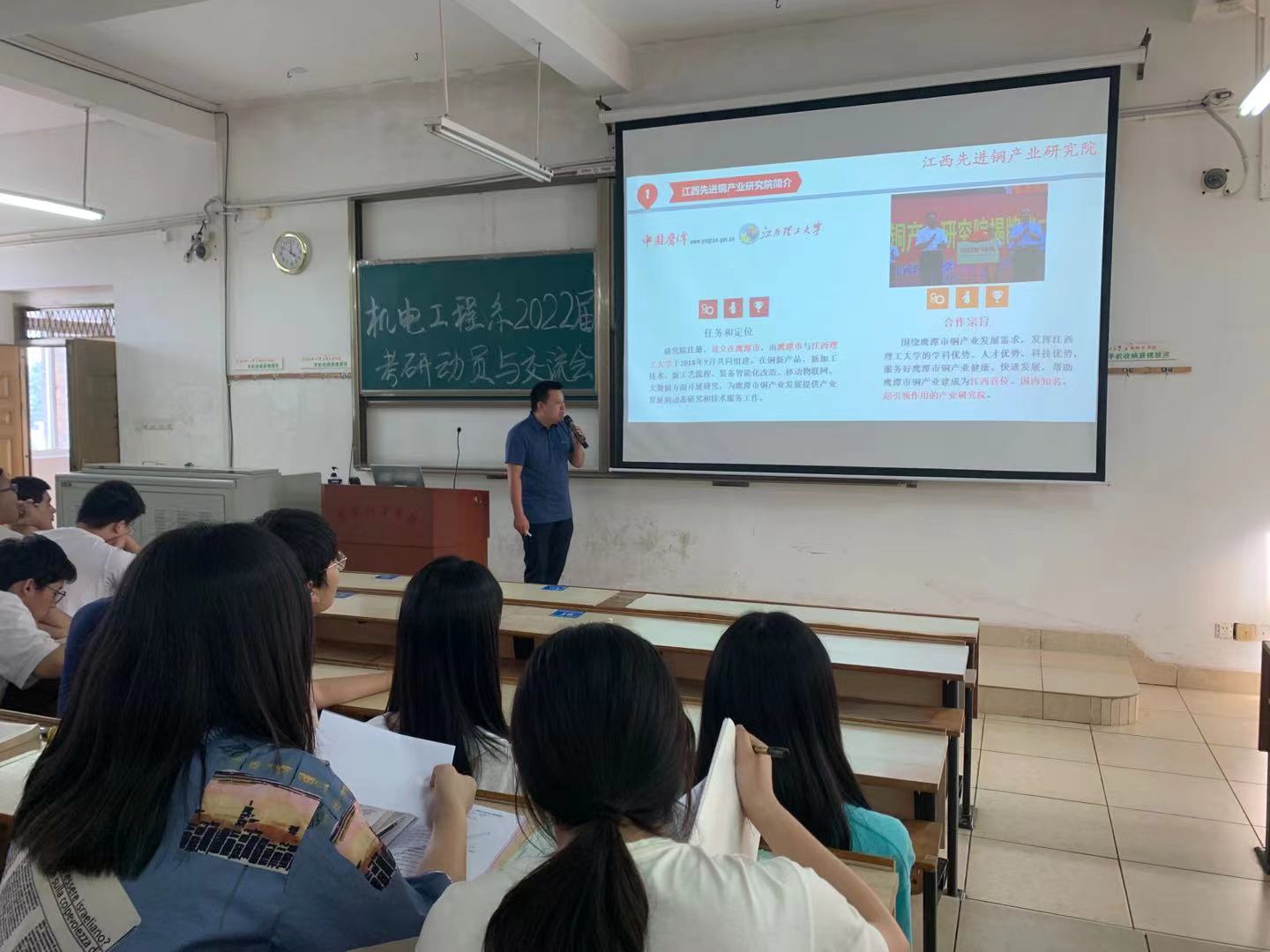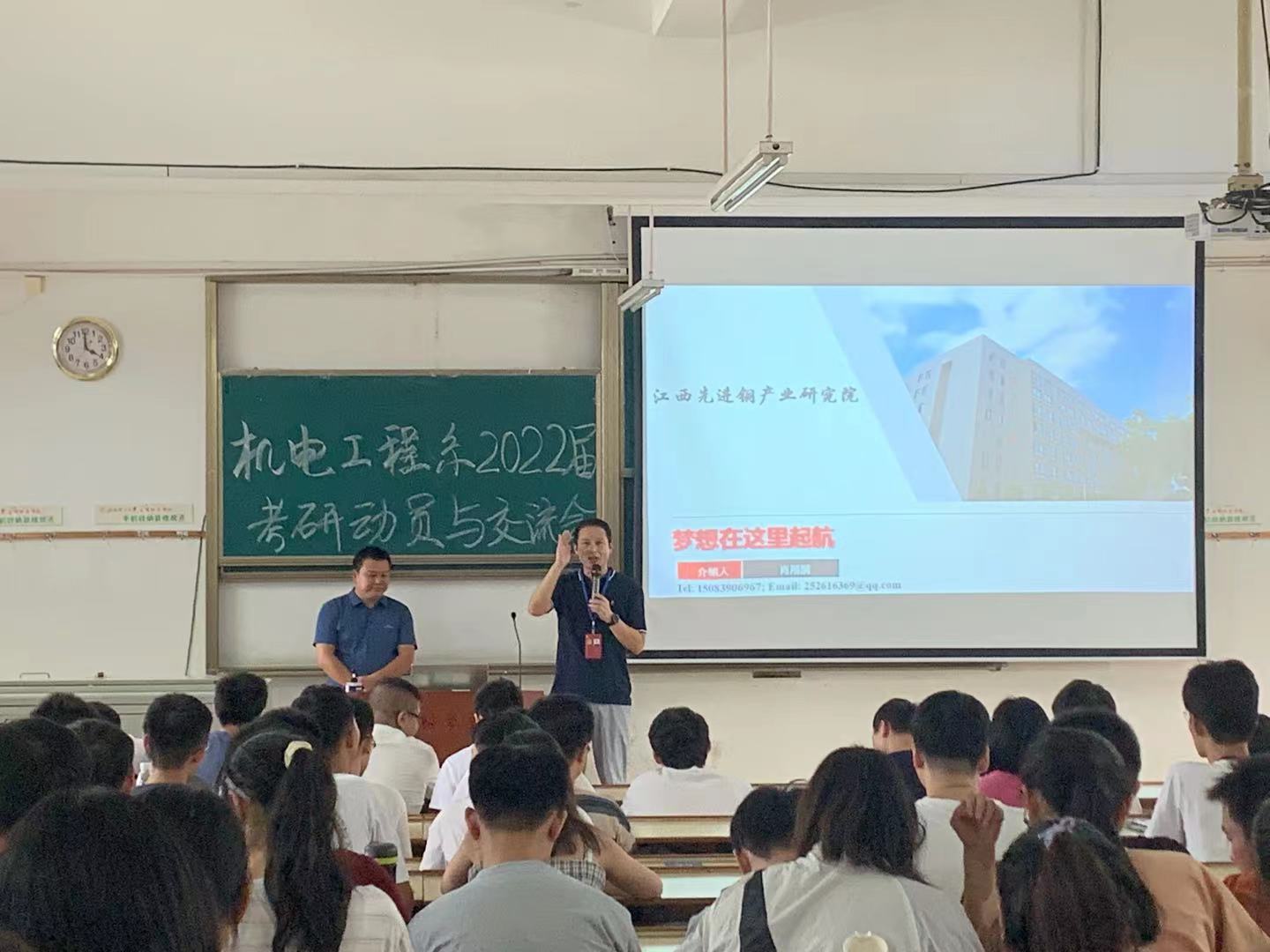 江西先进铜产业研究院副经理肖翔鹏、永磁磁浮技术与轨道交通研究院邓永芳博士分别介绍了研究院的相关情况,并从研究院的团队情况、研究领域、科研成果、招生政策和奖学金项目等多角度分析了专业优势,激励大家要认真对待,积极备考,争取深造机会,并鼓励员工报考本校研究生。