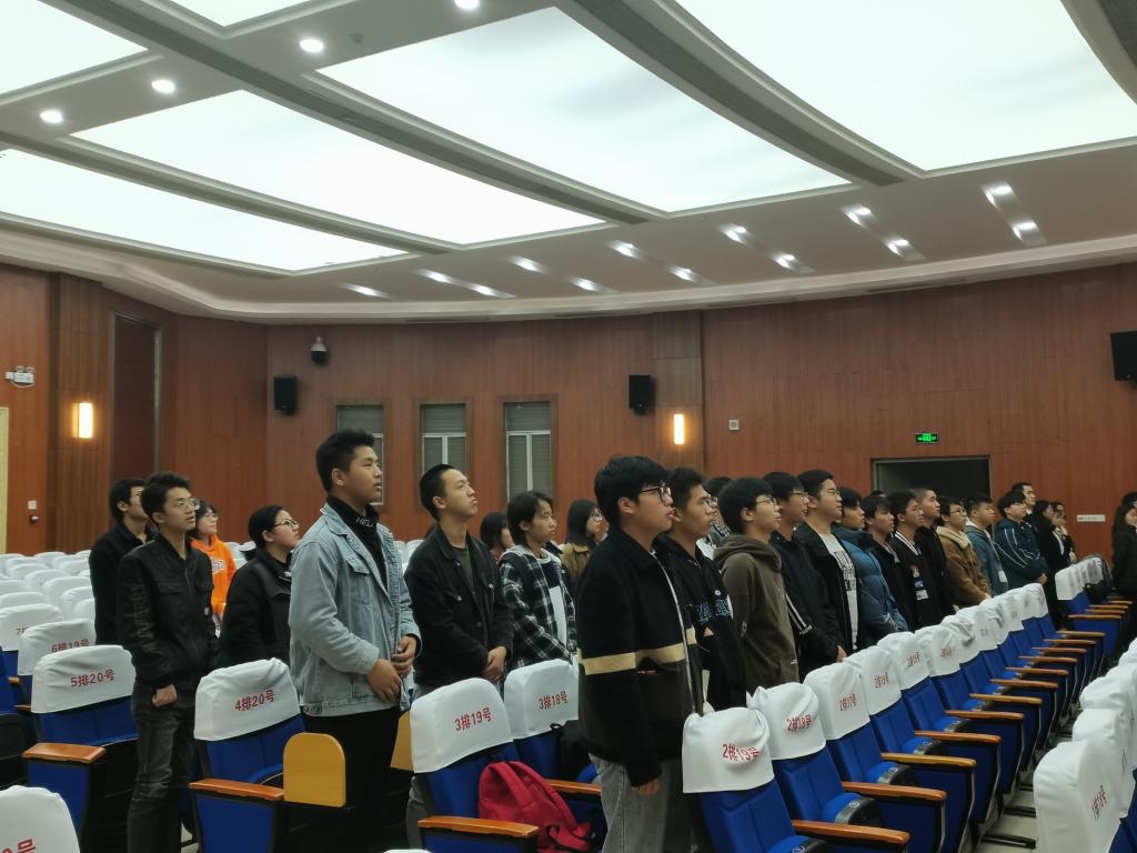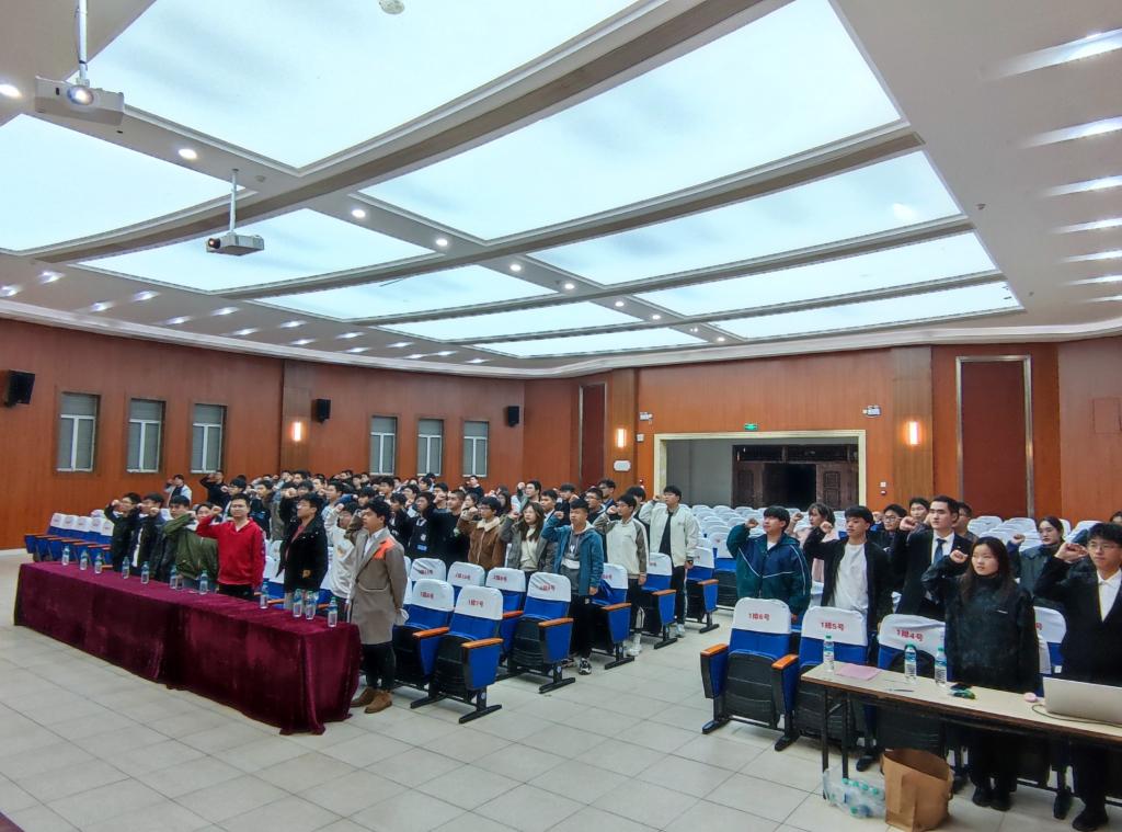 大会议程第项:期青马班班助代表舒毅同学带领全体新学员宣誓、老学员重温誓词。