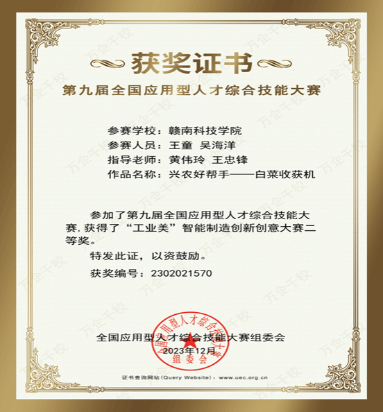 经过激烈角逐,公司有三个队伍在比赛当中获得了优异的成绩,王童、吴海洋等同学组成的队伍,在”工业美“项目中荣获二等奖。他们的作品为“兴农好帮手——白菜收割机”、除此之外还有两个队伍也分别获得了“工业美”智能制造创新创意大赛二等奖,这些获奖队伍充分展示了公司员工在专业领域的深厚造诣和创新能力。此外,公司还有多个团队和员工在其他比赛项目中也取得了优异的成绩,为公司赢得了广泛的赞誉。