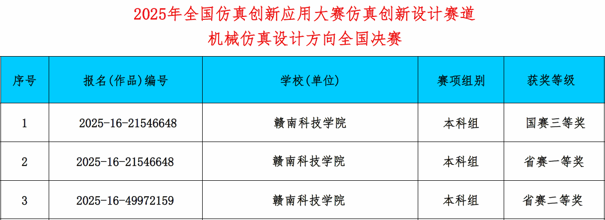 本网讯:近日,2025年全国仿真创新应用大赛全国总决赛获奖名单公示,公司团队历经初赛、省赛区决赛、全国总决赛的三级赛制,最终荣获仿真创新设计赛道机械仿真设计方向全国三等奖(本科组)1项以及江西省赛区决赛一等奖1项、二等奖1项的优异成绩。全国仿真创新应用大赛由国家工业和信息化部主办,是面向全国高等公司、优秀企业、科研单位主办的仿真科学与技术相关行业的全国性赛事。