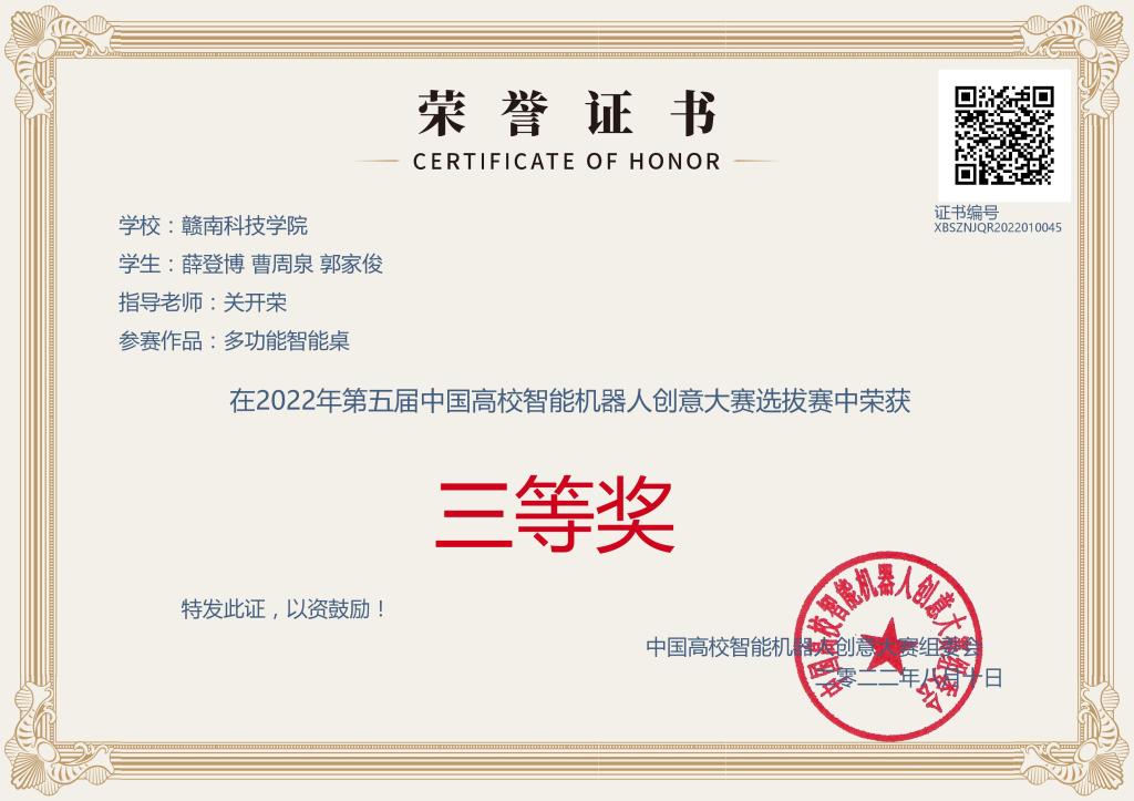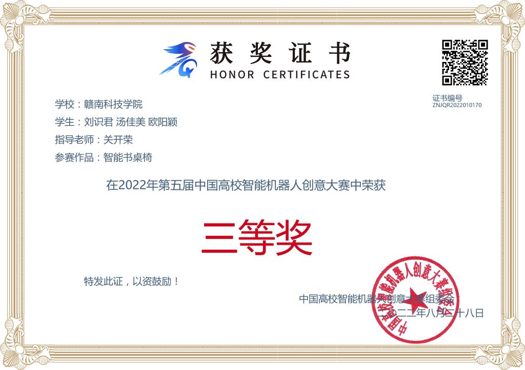 公司参赛作品经过区域赛选拔和总决赛,最终,4支队伍在区域赛中获奖,2支队伍在全国决赛中获奖。其中,赖盛昊、廖章英、陈宇团队设计的作品“多功能消毒机器人”获得国家二等奖,刘识君、汤佳美、欧阳颖团队设计的作品“智能书桌椅”获得国家三等奖,王桥根、邓紫嫣、吴绮雯团队设计的作品“智能天花板清扫机器人”获得选拔赛二等奖,薛登博、郭家俊、曹周泉团队设计的作品“多功能智能桌”获得选拔赛三等奖。