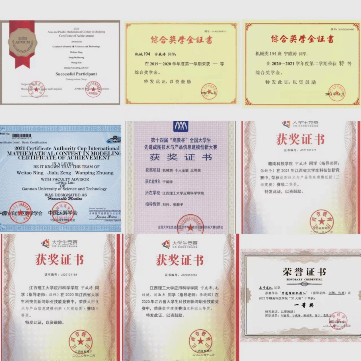 除此之外,他还积极的参加了数学建模,全国智能制造大赛、小美赛、亚太赛、全国三维数字大赛等各项竞赛活动,共获取了7项国家级奖项,省级奖项7项以及院级奖项11项。