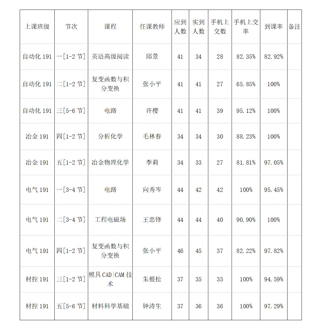 从数据来看冶金191班到课率较高,表现良好,希望能够继续保持!