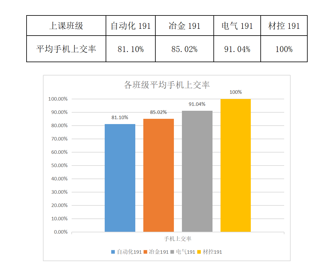 由上表看出材控191班手机上交率较高,表现良好,希望继续保持!