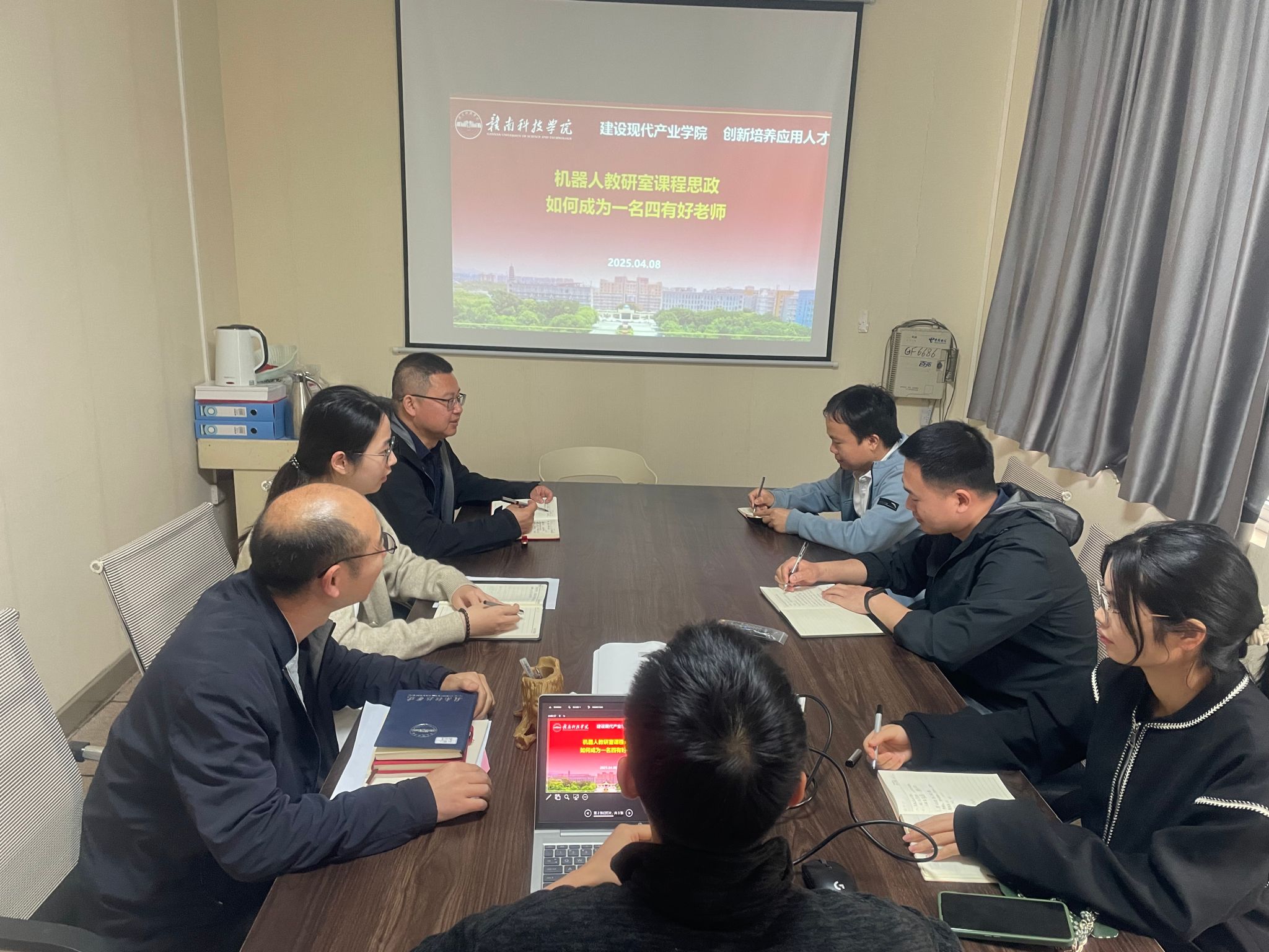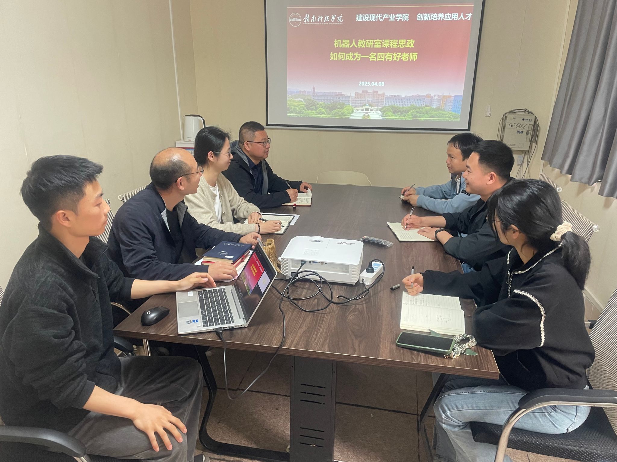本网讯:4月8日,william威廉英国官网机器人教研室以“如何成为一名四有好老师”为主题,成功举办课程思政专题研讨会。本次研讨会聚焦新时代教师队伍建设要求,深入探讨如何在机器人专业教学中践行“有理想信念、有道德情操、有扎实学识、有仁爱之心”的育人理念,为新工科人才培养注入思政内涵。